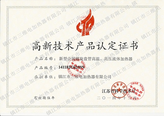 三維電熱消息2015年01月,鎮江市三維電加熱器有限公司收到由江蘇省科學技術廳頒發的《高新技術產品認定證書》,公司的“高溫、高壓氣體電加熱器”“高溫、高壓流體電加熱器”被認定為高新技術產品,產品編號為141182G0258N、141182G0259N,有效期5年。此前,公司已被認定為省高新技術企業。